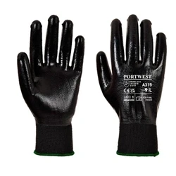 Introducing the Portwest All-Flex Grip Glove - Black. A paradigm shift in the world of protective gloves, these are engineered with precision to cater to those seeking both comfort and top-notch performance.Key Features: Ultimate Liquid Protection: The glove’s full nitrile coating ensures superior resistance against abrasions, liquids, and oil, allowing you to work in challenging environments without a hitch. Perfect Fit: Crafted with a 13-gauge liner, it guarantees a snug fit, ensuring optimal dexterity and minimal hand fatigue. Stay Dry: Its unique oil and water-resistant properties mean your hands remain dry and protected, irrespective of the conditions. Enhanced Comfort: Featuring an inner elasticated cuff and lightweight design, comfort is at the forefront, making extended wear a breeze. Minimal Contamination: Thanks to its low linting construction, risks related to contamination are significantly minimized. Ergonomic Excellence: Specifically designed to be ergonomic, the glove reduces hand fatigue, ensuring productivity remains at its peak. Certified Quality: Meeting rigorous standards set by SATRA Technology Europe Ltd, EN ISO 21420: 2020 Dexterity 5, and EN 388: 2016 + A1: 2018 (3121X), rest assured you're getting nothing but the best.Equip yourself with the Portwest All-Flex Grip Glove - Black. Whether it's a demanding work environment or a rigorous DIY project, these gloves stand as a beacon of unparalleled protection and comfort.