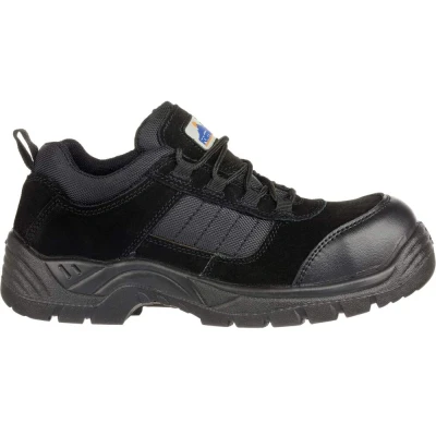 Discover the Portwest Compositelite Trouper Shoe in Black. Engineered as a lightweight hiker-style shoe, it presents itself in a timeless black hue. Featuring a composite toecap, antistatic properties, and an oil-resistant outsole, this shoe caters to diverse working conditions and environments.Key Features: Airy Comfort: Equipped with a 3D breathable mesh lining, it ensures your feet experience optimal ventilation throughout the day. Metal-Free Excellence: The 100% metal-free design ensures a lightweight and hassle-free experience, perfect for professionals on the go. Effortless Wear: The inclusion of a back pull-tab simplifies the process of wearing the shoe, enhancing user convenience. Durable Construction: Made with a combination of suede and textile for the upper, this shoe promises both longevity and aesthetic appeal. Ultimate Comfort: The padded collar is strategically designed to provide maximum comfort, especially during extended wear. Optimal Protection: The composite toecap stands as a testament to the shoe's commitment to offering premium foot protection against potential workplace hazards. Recognized Quality: The shoe boasts of its CE certification and is also marked UKCA, underlining its commitment to meeting stringent quality and safety benchmarks.Endorsed by Intertek Italia S.p.A. and aligning with the EN ISO 20345: 2011 S1 standard, the Portwest Compositelite Trouper Shoe is the perfect blend of style, safety, and functionality. It's the ideal choice for those who demand top-notch quality and performance from their work footwear.