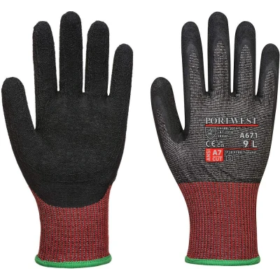 Opt for the top-tier protection offered by the Portwest CS AHR13 Latex Cut Glove in Black. This glove, a part of the esteemed CT200 collection, showcases radical low light visibility coupled with premium features making it a must-have for any individual looking for a superior hand protection solution. Experience an impeccable blend of safety and comfort as you undertake tasks in various environments.Key Features: Level F Cut Resistance: Offers the highest level of cut resistance, providing an excellent shield against glass, blades, and abrasions, ensuring safety in high-risk environments. Enhanced Grip: The crinkle latex grip promises excellent hold in both wet and dry conditions, facilitating a firm and confident grip as you work. Breathable Seamless Liner: Crafted with a 13-gauge liner that not only promises a perfect fit but also promotes breathability for long-lasting comfort. Reflective Label: Enhances visibility in low light conditions, augmenting safety during nighttime or in dimly lit environments. CE Certified: Aligns with the essential safety requirements, offering a glove that is not only comfortable but also protective.Compliance with Industry Standards: EN ISO 21420: 2020 Dexterity 5: Ensures high dexterity, promising easy handling and maneuverability in tasks requiring fine motor skills. EN 388: 2016 + A1: 2018 (3X44F): Demonstrates high resistance to abrasions and cuts, with a respectable score in tear and puncture resistance tests according to the EN 388 standard. ANSI/ISEA 105: 2016 Levels: Attains high scores in the ANSI/ISEA 105: 2016 standard, showcasing excellent cut, abrasion, and puncture resistance levels.With the Portwest CS AHR13 Latex Cut Glove in Black, enjoy a harmonious blend of strength, comfort, and enhanced visibility, providing a comprehensive solution to your safety needs. Equip yourself with a glove designed for optimal performance and protection.