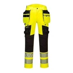 Enhance your safety and comfort during work with the Portwest DX4 Hi-Vis Detachable Holster Pocket Trouser in Yellow/Black. This trouser is expertly designed to facilitate ease of movement while providing an excellent storage solution, showcasing a brilliant blend of safety and functionality.Key Features: Dynamic 4X Stretch Fabric: Ergonomically designed with targeted placement of 4-way stretch fabric, ensuring maximum range of movement while working. High-Rise Back Waistband: Features a high-rise back waistband with side elastication, offering protection in all working positions. Reflective Tape: The lightweight and flexible HiVisTex Pro segmented reflective tape enhances visibility in low light conditions. Ample Storage: Equipped with 16 pockets including pre-bent top-loading adjustable knee pad pockets, front pockets, and multi-functional zip thigh pockets for secure storage. ID Card Holder: Includes a dedicated space for ID card display, adding to the functionality. Enhanced Durability: The triple stitching throughout the trouser ensures maximum durability, sustaining wear and tear over time. UPF Protection: The fabric is rated 40+ UPF, offering protection by blocking 98% of harmful UV rays.Certifications: SATRA Technology Europe Ltd EN ISO 20471 Class 2 EN 14404: 2004 + A1: 2010 Type 2 Level 0 (When used in combination with S156)The Portwest DX4 Hi-Vis Detachable Holster Pocket Trouser stands as a reliable choice for professionals seeking a balance of comfort, functionality, and safety. Whether working in construction or handling roadside tasks, you can count on this trouser for enhanced performance.