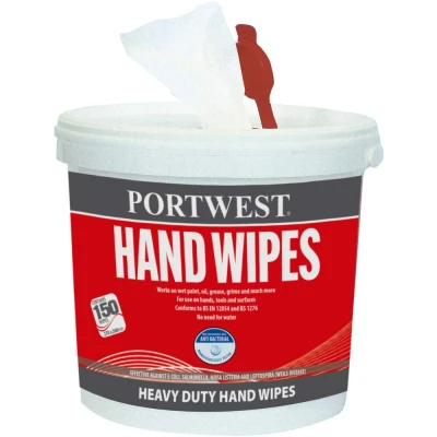 Keep your hands and tools impeccably clean and germ-free with the Portwest Hand Wipes (150 Wipes) - White. These versatile wipes are not just for your hands; they can tackle stubborn dirt, grease, and paint on various surfaces and tools, all while leaving a pleasant orange fragrance behind.Key Features: Powerful Cleaning: Efficiently eliminates wet paint, oil, grease, and grime. Ideal for a vast array of cleaning needs in both professional and personal settings. Versatile Application: Formulated for use on hands, surfaces, and even tools, offering wide-ranging cleaning solutions. Antibacterial Action: Kills 99.9% of bacteria, ensuring your hands and tools are not just clean, but also free from harmful germs. Fast-Acting: The advanced formula acts swiftly to annihilate bacteria, making it a reliable choice for quick clean-ups. Fresh Orange Fragrance: Leaves a delightful orange scent post-cleaning, adding a refreshing touch to the cleanliness.Compliance with Industry Standards: EN 1276, EN 14476, EN 1650, EN 13697, EN 13727: These standards affirm the wipes' efficacy against a range of bacteria, ensuring you're protected against common pathogens like E - coli, Salmonella, MRSA, Listeria, and Weils Disease.The Portwest Hand Wipes (150 Wipes) - White stand as a testament to hygiene combined with convenience. Whether you're at work, home, or on-the-go, trust these wipes to offer a clean sweep, literally!