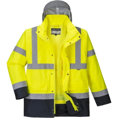Discover the Portwest Hi-Vis 4-in-1 Contrast Traffic Jacket - Yellow/Navy, a masterpiece of ingenuity tailored to deliver flexibility, comfort, and optimal protection. With its 4-in-1 design, this jacket is meticulously crafted to suit a plethora of weather conditions, ensuring maximum visibility, especially in low light situations.Key Features: Four-Way Versatility: The jacket's multifaceted design allows for four distinct combinations – a lightweight outer, a combined outer with body warmer, a standalone body warmer, and a reverse-color body warmer – ensuring adaptability to diverse climatic conditions. Robust Weather Protection: Boasting waterproof capabilities and diligently taped seams, the jacket promises unparalleled defense against water. The specialized fabric ensures water simply beads off its surface. Advanced Design Elements: From a pack-away hood for streamlined storage to an internal chest pocket for safeguarding essentials, every feature of this jacket is designed keeping user convenience in mind. The silver reflective hood enhances visibility while the inner ribbed cuffs amplify warmth and comfort. Dirt Defense: Contrast panels not only add a touch of style but also combat and mask dirt, keeping you looking impeccable even in demanding environments. Enhanced Visibility: Adorned with reflective tape, the jacket prioritizes wearer safety by ensuring optimum visibility in challenging lighting.Adherence to Renowned Standards: SATRA Technology Europe Ltd: Testament to the jacket's unparalleled quality and durability. EN ISO 20471 Class 3: Validates the jacket's superior visibility standards, making it essential for high-risk settings. EN 343 Class 3:1 X (WP 15,000mm): Certifies the jacket's elite water-resistant capabilities.Choosing the Portwest Hi-Vis 4-in-1 Contrast Traffic Jacket - Yellow/Navy is an affirmation of your commitment to safety, versatility, and style. Embodying Portwest's dedication to innovation and functionality, this jacket stands out as a must-have for those who demand the very best in protective wear.