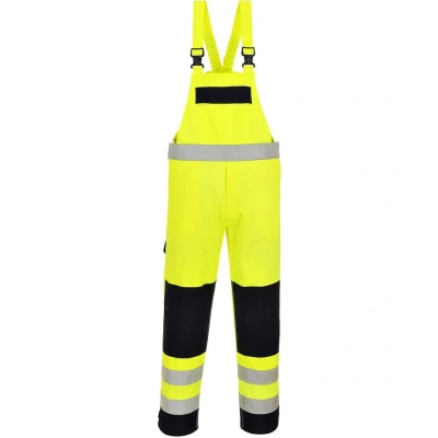Equip yourself with the Portwest Hi-Vis Multi-Norm Bib and Brace in Yellow/Navy, a remarkable protective garment designed to secure you against a range of risks prevalent in demanding work environments. This bib and brace, crafted with the highly recognized fabric utilized in the FR60, guarantees comfort while you undertake your daily tasks.Key Features: Multifaceted Protection: The garment stands tall with certifications from renowned entities such as SATRA Technology Europe Ltd, meeting stringent standards such as EN ISO 11612 and IEC 61482, offering protective layers against radiant, convective, and contact heat, and guarding against molten metal splash hazards. Practical Pockets: The functional design features an array of pockets, including two front patch pockets, a handy chest pocket with a flap, and a special rule pocket, making it a versatile choice for professionals who need their tools and personal items close at hand. Adjustable Fit: Offering adjustable straps, the bib and brace allow for a customized and secure fit, enhancing comfort and ease of movement while you work. Durability Guaranteed: Designed with a durable brass zip, this garment promises a long lifespan, standing robust against the daily wear and tear in high-risk environments. Enhanced Visibility: Featuring twin-stitched hi-vis strips on the legs and waist, this bib and brace complies with the EN ISO 20471 Class 2 standard, promising high visibility that can be a lifesaver in low light conditions. Modern Aesthetic: Beyond functionality, the bib and brace present a modern look with contrast colouring, adding a touch of style to your safety workwear. Extra Resilient: Equipped with sew-on flame-resistant industrial wash tape, the bib and brace exhibit enhanced resilience, promising safety across numerous wash cycles.Choose the Portwest Hi-Vis Multi-Norm Bib and Brace for a reliable blend of safety, durability, and style, assuring a secure and comfortable work experience in hazardous environments.