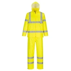 Introducing the Portwest Hi-Vis Packaway Rainsuit in Striking Yellow. Crafted for those seeking a perfect blend of visibility, safety, and performance in harsh weather conditions, this rainsuit provides top-notch functionality without compromising on style.Key Features: Ultimate Waterproofing: Built with taped seams, it promises a complete barrier against water, ensuring you remain dry irrespective of the rainfall intensity. Superior Water-Repellency: The special fabric not only combats water but makes droplets bead and roll off, further enhancing its waterproof properties. Optimized Breathability: The addition of a vented back yoke ensures efficient air circulation, avoiding sweat build-up and maintaining optimum comfort. Adaptable Fit: Equipped with features like a drawcord hood and hem, inner elasticated cuffs, and stud-adjustable hems, the rainsuit promises a snug and comfortable fit for all. Robust Build: The twin-stitched seams amplify the rainsuit's longevity, ensuring it withstands the test of time and use. Enhanced Visibility: Outlined with reflective tape, this rainsuit guarantees optimum visibility, a critical safety measure in low-light conditions. Compact Storage: A practical design allows the rainsuit to be conveniently rolled up and stored when not needed, making it perfect for travelers and professionals on the move.Certified Standards: OETI (Institut für Ökologie, Technik und Innovation GmbH) EN ISO 20471 Class 3 EN 343 Class 3:1 X (WP 5,000mm)With the Portwest Hi-Vis Packaway Rainsuit in Yellow, you're equipped to face any weather challenge head-on, while ensuring you remain visible and safe in all scenarios.