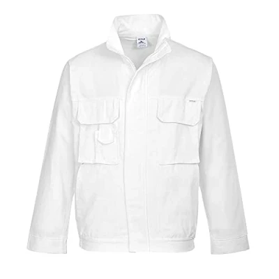 FEATURES: This contemporary jacket includes a layered chest pocket with mobile phone and pen sections. The waist elastication allows for extra comfort and ease of movement, while the hook and loop cuffs make for a more secure fit. COMFORT: This pre-shrunk jacket is made from 100% cotton fabric to give the wearer added comfort and breathability and 50+ UPF rated fabric to block 98% of UV rays. PRODUCT CARE: Machine wash very hot up to 60°C. Wash dark colors separately. Do not bleach. Do not tumble dry. Line dry. Medium iron. professional dry cleaning in tetrachloroethene and all solvents listed for the symbol F normal process. MATERIAL, SIZE AND RANGE: Painters Jacket. Available in White (S-XXL). Shell Fabric : 100% Cotton, 3111, Pre-Shrunk 305g.