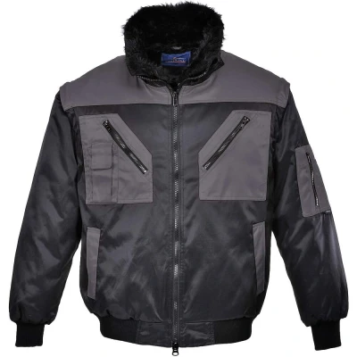 Discover the Portwest Two Tone Pilot Jacket - Black/Grey: A modern interpretation of the classic pilot jacket. Showcasing a contemporary two-tone design, this jacket stands out both in form and function. It’s versatile, with zip-out sleeves and an array of storage options, and is enhanced by the inclusion of a removable fur liner and collar. Moreover, its water-resistant finish ensures that you're prepared for any weather, making it the perfect all-rounder for those in search of style and substance.Key Features: Supreme Comfort: Boasting a high cotton content, this jacket ensures a luxurious feel and unmatched comfort. Weather-Ready: The fabric is not just water-resistant; it actively repels water, ensuring you stay dry even in unexpected showers. Plenty of Storage: Equipped with 6 pockets, offering abundant space for tools and personal belongings. It also features a dedicated phone pocket for convenience. Multi-Functional Design: The jacket’s design allows it to be worn in four distinct ways, catering to a range of preferences. Additionally, its zip-out sleeves offer even more versatility. Swift Access: Fitted with a two-way zip, ensuring easy and prompt access whenever required. Optimal Fit: Features a ribbed hem, guaranteeing a snug and comfortable fit every time you wear it.The Portwest Two Tone Pilot Jacket - Black/Grey is a testament to detailed craftsmanship and modern design. It's a must-have for those who appreciate quality, utility, and aesthetic appeal in their workwear.
