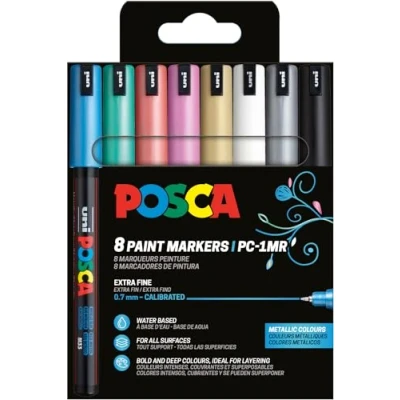 POSCA Pens Set for Artists and DIY Lovers: 8 colors set contains the colors black, white, gold, silver, metallic blue, metallic green, metallic red and metallic pink - suitable for creative drawing on a wide variety of materials Adheres to almost all materials: permanent on wood, stone, fabric and paper, erasable on glass, metal and plastic - suitable for custom designs Fine round tip for precise lines: 0.7mm fine tip allows you to achieve filigree detail when drawing, writing or coloring; tip is replaceable for particularly long-lasting use Long-lasting permanent marker with high opacity: highly pigmented color ensures bold and vibrant results, dries quickly and does not fade Ideal for hobby, school and professionals: for painting stones, painting fabrics or for craft projects, waterproof acrylic pens are versatile and easy to use
