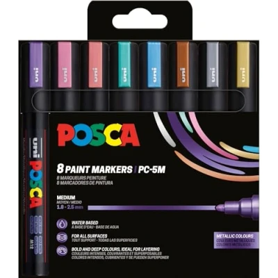 POSCA Pens Set for Artists and DIY Lovers: 8 colors set contains the colors gold, silver, bronze, metallic blue, metallic green, metallic red, metallic pink and metallic purple - suitable for creative drawing on a wide variety of materials Adheres to almost all materials: permanent on wood, stone, fabric and paper, erasable on glass, metal and plastic - suitable for custom designs Fine Round Tip for Precise Lines: The fine tip of 1.8 to 2.5 mm allows you to get filigree detail when drawing, writing or coloring. The tip is replaceable for particularly long-lasting use Long-lasting permanent marker with high opacity: highly pigmented color ensures bold, vibrant results, dries quickly and does not fade Ideal for hobby, school and professionals: for painting stones, painting fabrics or for craft projects, waterproof acrylic pens are versatile and easy to use
