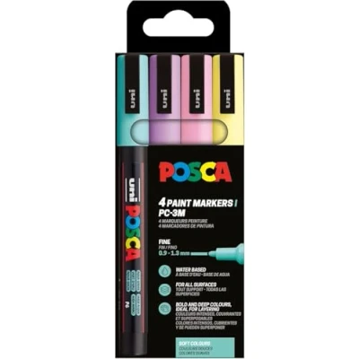 POSCA Pencils Set for Artists and DIY Lovers: The set of 4 contains the colors teal, lavender, light yellow and light pink, suitable for making creative drawings on a wide variety of materials Adheres to almost all materials: permanent on wood, stone, fabric and paper, erasable on glass, metal and plastic - suitable for custom designs Fine Round Tip for Precise Lines: The fine tip of 0.9 to 1.3mm allows you to get filigree detail when drawing, writing or coloring. The tip is replaceable for particularly long-lasting use Long-lasting permanent marker with high opacity: highly pigmented color ensures bold and vibrant results, dries quickly and does not fade Ideal for hobby, school and professionals: for painting stones, painting fabrics or for craft projects, waterproof acrylic pens are versatile and easy to use