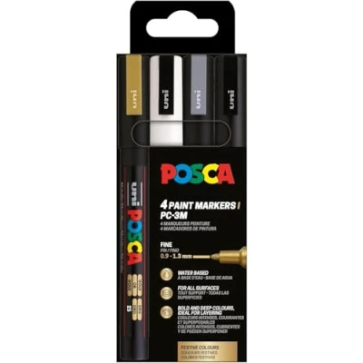 POSCA Pens Set for Artists and DIY Lovers: The set of 4 colors contains the colors black, white, gold and silver, suitable for creative drawing on a wide variety of materials Adheres to almost all materials: permanent on wood, stone, fabric and paper, erasable on glass, metal and plastic - suitable for custom designs Fine Round Tip for Precise Lines: The fine tip of 0.9 to 1.3mm allows you to get filigree detail when drawing, writing or coloring. The tip is replaceable for particularly long-lasting use Long-lasting permanent marker with high opacity: highly pigmented color ensures bold and vibrant results, dries quickly and does not fade Ideal for hobby, school and professionals: for painting stones, painting fabrics or for craft projects, waterproof acrylic pens are versatile and easy to use