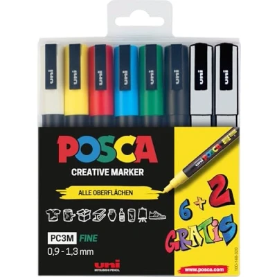 POSCA Faber Castell uni ball 186825 Marker Set, 8 Case Acrylic Pens PC 3M, 0.9 1.3 mm, 6 Standard Colours + 2 Changing Special