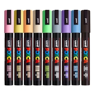 9 VIBRANT STANDARD COLOURS – Our paint marker pens feature an agile set of Medium 1.8-2.5mm tip acrylic pens, ideal for fine-line art, drawing, and more. With colour-coded caps for quick identification, creating has never been easier. Colours may vary PAINT IN A PEN– These felt tip pens for adults feature ultra-durable, washable, and reversible tips, designed to last. The push-in mechanism primes and re-saturates the marker, and the built-in ball ensures consistent texture and smooth paint flow every time DESIGNS THAT LAST – These posca markers deliver vibrant, UV-protected colours that stand up to the elements. Permanent on porous surfaces and erasable on smooth materials like glass. For added durability, seal your designs with a fixative varnish ALL SURFACES – These artist pens bring creativity to life on any surface! From wood, fabric, and textiles to glass, ceramic, paper, plastic, metal, canvas - ideal as markers for adult colouring books and more, our colour-intense paint delivers beautiful results every time HOUSEHOLD FAVOURITE – Safe for all ages, these colour pens use water-based, odourless, and non-toxic formula that's ideal for everyone in the family—whether you're an artist, crafter, or DIY enthusiast