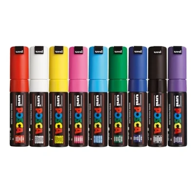 Posca PC 8K Standard Pack of Paint Markers (Pack 9) Multisurface Water Based Pens with Large 8mm Chisel Acrylic Tips for Adult Colouring Books, Art and Crafts 4 Stickers