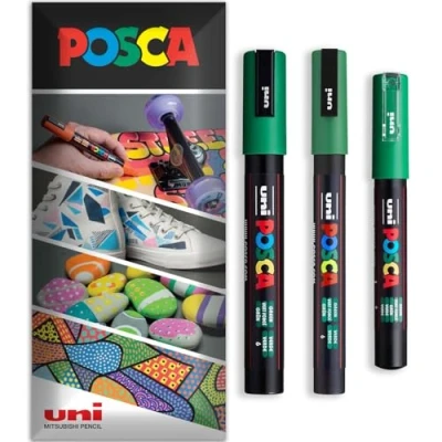 Posca Water Based Permanent Marker Paint Pen Multi Surface Use PC 1M, 3M, 5M Pack of 3 Pens in Wallet (Green)
