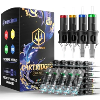 【Complete Variety Pack】50 sterile tattoo needles (5 sizes × 10 each) including 1203RL,1205RL,1207RL,1209RL,1211RL. The spiral nozzle design holds 30% more ink than standard needles, while laser-sharpened tips ensure crisp lines and smooth shading - perfect for both studio professionals and home practice. 【Precision Engineered Performance】Featuring Japanese-grade 316L stainless steel tips brazed to PVC cartridges. Each needle undergoes 12 quality checks for consistent sharpness, durability, and vibration reduction. Maintain pigment integrity through 6+ hours of continuous use. 【Anti-Leak Safety System】Triple-seal design combines: ① High-elasticity rubber membrane connection ② Spiral ink reservoir ③ UV-bonded nozzle. Prevents blowouts and backflow while protecting your tattoo machine from ink contamination. 【Universal Compatibility】Precision 0.35" (9mm) cartridge base fits all major tattoo machine brands. Standardized production ensures plug-and-play functionality - no calibration needed. 【Sterile Assurance & Support】Each needle is sterilized by ethylene oxide gas and vacuum packed in accordance with international hygiene standards.Backed by our Poseidon Promise: 24hr customer support response, lifetime defect replacement, and no-questions-asked refunds. Your satisfaction is 100% guaranteed.