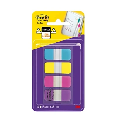 Post it Index Strong Filing Tabs, Small 40 15.8 mm x 38.1 mm, Blue, Purple, Pink, Yellow Extra Sticky Flags for Documents and Information