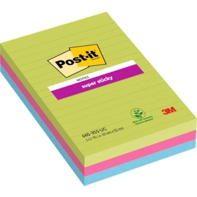 Post it Super Sticky Large Notes, Assorted Colours, Lined, 101 mm x 152 mm, 90 Sheets/Pad, 3 Pads Self Stick Notes for Note Taking, to Do Lists & Reminders