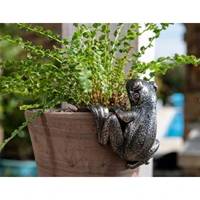 AmazonAntique Bronze Frog Pot Buddy Hang from anything with a 'lip edge' and add interest to your planters and pots. Frost proof, UV resistant and hand painted using lead-free products. Made from a durable poly resin and crushed stone based material Size: 10.5cm × 5cm × 11cm (Approx)