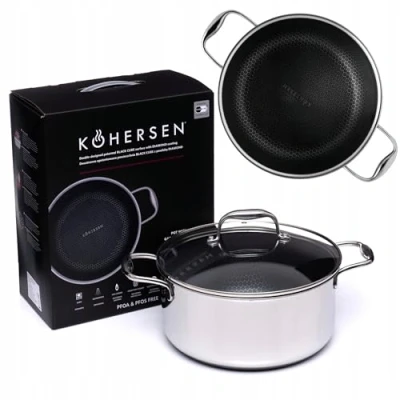 New cooking quality: the Kohersen pot is a new cooking quality! The hybrid construction of the body allows for faster preparation of dishes. Thanks to the non-stick coating, there is little fat during food preparation. The dishes remain tasty and at the same time healthy and dietary. This limits calorie intake and the formation of harmful substances. Black Cube technology: The patented double-sided functional surface of the BLACK CUBE technology has a unique honeycomb structure that allows extremely effective heat distribution over the entire usable area. The combination of stainless steel nubs and a concave coated surface prevents food from sticking. LONG TERM DURABILITY The durable, damage-resistant DIAMOND coating is an added layer of protection to the surface of the dishes - it helps to protect the dishes from scratches, even when using sharp kitchen utensils such as spatulas or rough metal sponges. The Diamond coating is abrasion-resistant and provides long-term protection - up to 10,000 abrasions Modern design: the BLACK CUBE line impresses with its modern, sophisticated design. They are suitable for any home and restaurant. You can cook on any hob, whether gas, electric, ceramic, halogen or induction, and even bake in the oven. The dishes can be washed in the dishwasher. ECO-FRIENDLY DISHES - Out of consideration for health and the planet, Kohersen dishes are made from a material that does not contain harmful PFOA and PFOS substances that are classified as water pollutants and have an impact on the development of diseases. In addition, you save water and energy thanks to Kohersen dishes The purchase includes a Kohersen frying pan with tempered glass lid. Dimensions: Capacity: 4.9 litres; Diameter: 24 cm; Depth: 11 cm; Height of pot with lid: 19 cm; Weight of pot: 1.56 kg; Lid weight: 0.67 kg