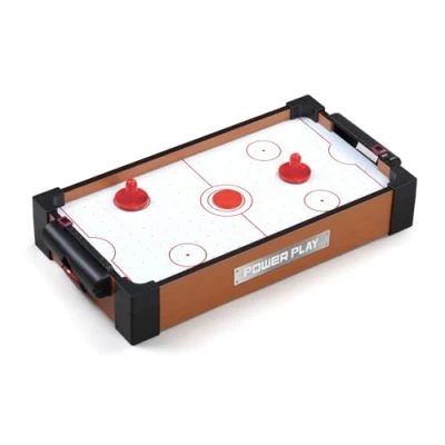 COMPLETE AIR HOCKEY TABLE: Bring an arcade classic home with this premium Power Play air hockey table. children will improve hand-eye coordination and motor skills by this portable air hockey set FEATURES: Includes air hockey table with air jets, slider score boards, puck and two pushers LIGHTWEIGHT AND PORTABLE: Play with your friends or family anywhere thanks to its portable and lightweight design, such as in the study, kids' room, living room, and outdoors DESIGN: Sturdy structure with wood grain finish for lasting durability ensure many years of enjoyment. The handles have been designed for easier gripping IDEAL GIFT: The exciting box makes this a perfect present for a Birthday or Christmas to last a life time. Ideal for high energy children who love to play games. Suitable for ages 5+, requires 3 x AA batteries (not included) product size 40.5 x 22 x 7 cm