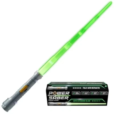 Automatic slide-in and out - the first luminous saber that not only extends but also automatically retracts for an enhanced Saber experience. Gives off a cool light: the Power Saber emits a beautiful green glow when extended. A cool extra that allows you to play or complete your cosplay. With sound: the Power Saber is accompanied by an epic sound when extended (and retracted). Defeat your enemies: Extended the Power Saber is 90 cm long, long enough to skilfully defeat your opponents. Batteries required: The Power Saber requires 4 AA batteries to use the different functions, they are not included., Manufacturer: Goliath