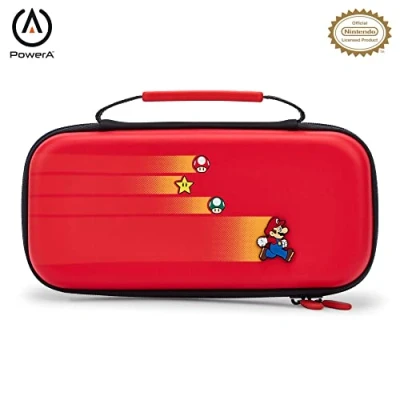 The dashing hero Mario along with star and mushroom powerups prove that speed is the best defense. Sturdy outer shell with rubberized handle and durable dual zipper pulls Built-in play stand for Tabletop Mode Molded interior with felt lining plus zippered mesh storage fits either system Built-in padded screen-protector flap includes game storage for nine game cards Officially licensed by Nintendo with two-year limited warranty, Platforms: Nintendo Switch
