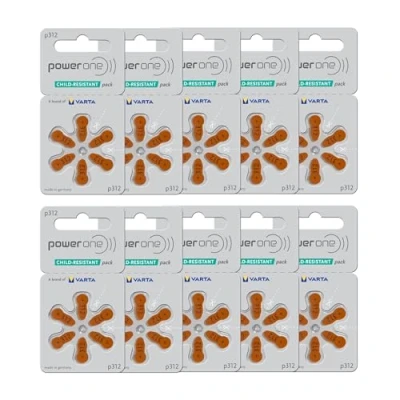 10 x blister pack of 6 Powerone hearing aid batteries, type 312, colour code, brown The rated voltage of the batteries is 1.45 volts. Diameter: approx. 7.9 mm, height: 3.6 mm