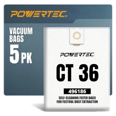 Includes: (5) CT 36 self cleaning filter bags Features: an easy-to-install design with an integrated flap that seals the bag, providing quick and easy disposal from your vacuums and compatible with Festool CT 36 dust extractors Efficiency: constructed of high quality, tear-resistant fleece cloth, able to capture harmful dust particles without releasing them back into the environment International products have separate terms, are sold from abroad and may differ from local products, including fit, age ratings, and language of product, labeling or instructions., Manufacturer: POWERTEC