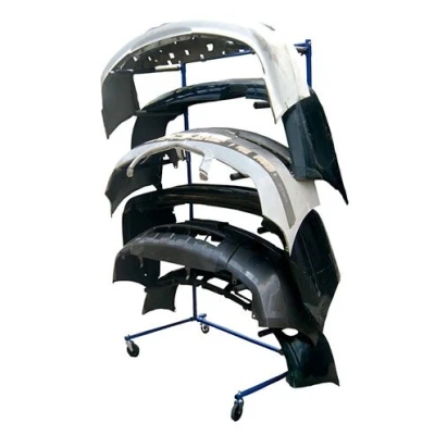 Height 2.1m. Stores bumpers whilst the vehicle is being repaired. Support arms are adjustable to allow for extra large bumpers. Secure space saving. Mobile for easy storage.