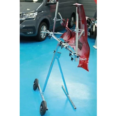 Adjustable panel stand, rotates 180° to allow access during preparation & painting. Two wheel fold-away design, making it easy to store when not in use. High quality steel construction. Maximum load capacity: 100kg. Made in Denmark. Additional brackets & accessories available separately, please see Part Nos. 92654 (Trim & Spoiler Kit), 92655 (Snapgrip), 92656 (Press Out Holding Tool).