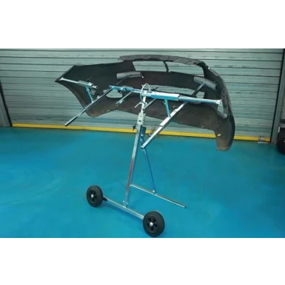Adjustable bumper stand, with integral plier grips, rotates & swivels through 90° to allow access during preparation & painting. Two wheel fold-away design, making it easy to store when not in use. High quality steel construction. Maximum load capacity: 100kg. Made in Denmark. Additional brackets & accessories available separately, please see Part Nos. 92654 (Trim & Spoiler Kit), 92655 (Snapgrip), 92656 (Press Out Holding Tool).