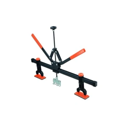 Adjustable bridge lifter to pull larger dents from vehicle bodywork panels, doors & bonnets etc. Suitable for keeping the panel under tension to allow for planishing & re-shaping. Overall length: 900mm. Height of bridge: 175mm. Features fully rotatable & adjustable feet (pull-plates), with 40° of movement. 6 claw dent removal panel puller. Thread size: M10 x 1.5. Also includes M14 adaptor for attachments. Slotted hooks attach to squiggly wire which is available separately, please see Part Nos. 91332, 91333 & 91378. Also suitable for use with glue pads, please see Part No. 92356.