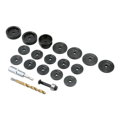 Hole cutter sizes: 17, 18, 18.2, 19, 20, 22.5, 24, 26, 26.7, 27, 28.1, 29.3, 32, 34, 38 & 38.9mm. Applications include: BMW, Citroën, Peugeot, Seat, Skoda, Toyota, Vauxhall/Opel & VW. Cuts plastic up to 5mm thick. HSS drill bit included for drilling pilot hole. NOTE: Not suitable for use with air tools. Supplied in a blow moulded case with a removable EVA foam tray.