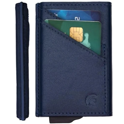 POWR Card Holder Wallet. Royal Blue Vegan Leather RFID for Men. Minimalist Wallet Credit Holders Pop Up Metal Slim