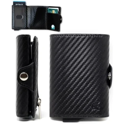 POWR Men's Black Carbon Fibre Minimalist RFID Blocking Wallet with Coin Compartment, Holds 8 Cards, Zipper Closure