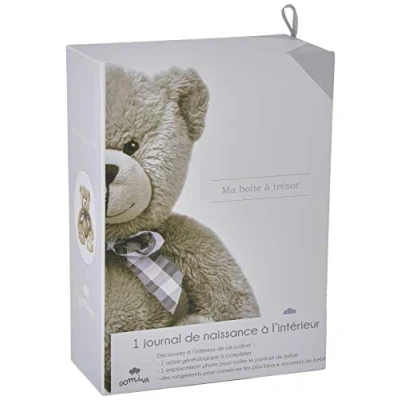 Set include 1 birth book with 48 illustrated pages, 1 genealogical tree Also includes 1 place for baby portrait, 3 souvenirs bags and 5 treasure drawers Closing with magnets Ideal and complete gift