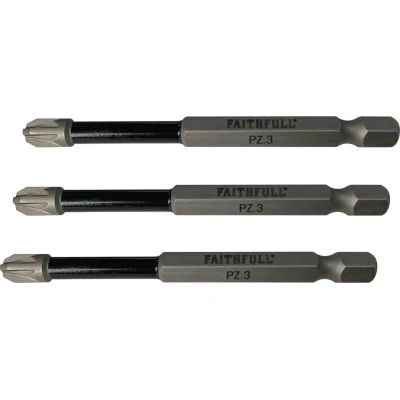 General description Faithfull Pozidriv Impact Screwdriver Bits are designed specifically for high torque impact drivers. Manufactured from a unique material engineered for extreme durability, these bits offer an increased working life compared to standard screwdriver bits. They feature torsion areas to absorb torque peaks, reducing stress at the bit tip during heavy loading, and a precision-machined tip for an optimum fit, helping to prevent screw stripping and cam-out. Technical specifications Head Type: Pozidriv Length: 75mm Overall Length: 75mm Pack Quantity: 3 Product Type: Screwdriver Bits Size: PZ3 Type: Pozidriv Compatibility and accessories Designed for use with impact drivers equipped with a 1/4 inch hex drive. Installation Insert the bit into the impact driver’s chuck or hex socket. Ensure it is securely fitted before use. Usage Use in impact drivers for driving Pozidriv screws. Apply appropriate torque to prevent damage to the bit or screw. Other information
