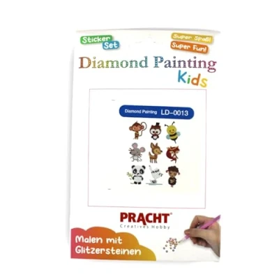Creative set for creating 9 diamond painting stickers with sticker templates, assorted stones, a small bowl, a pen and a square wax disc. Motif: animals - monkey, owl, bee, mouse, deer, fox, panda, duck and sheep; each sticker is about 4.5cm in size. All stickers are self-adhesive (no additional adhesive is required) and can be completely covered with coloured faceted stones. Once finished, the sticker can be peeled off and used to decorate and embellish photo books, cards, mobile phone covers, envelopes, planners, windows and more. Diamond painting promotes hand-eye coordination, concentration, patience and creativity of children and adults and contributes to relaxation and stress reduction., Manufacturer: Pracht Creatives Hobby