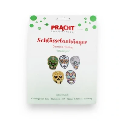 Creative set for drawing 5 diamond painting keychains with instructions, pendants with chain, assorted stones, a small bowl, a pen and a small square wax disc Design: Skulls - 5 skull pendants in different colours and designs All pendants are self-adhesive (no additional adhesive is required) and can be set entirely with coloured faceted stones. Once finished, the charms can be used to decorate keychains, backpacks, bags and more and are also ideal as a gift. Diamond painting promotes hand-eye coordination, concentration, patience and creativity of children and adults and contributes to relaxation and stress reduction., Manufacturer: Pracht Creatives Hobby