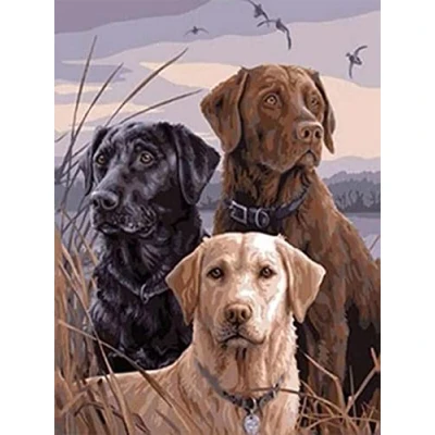 Creative set for creating a Diamond Painting painting with a picture pattern, assorted colored stones, a bowl, a pencil and a small square wax plate Subject: Dogs - 3 faithful companions of man immortalized in an atmospheric landscape; image size: approx. 35 x 25 cm The complete picture is self-adhesive, so that the colored faceted stones can be applied similarly to the colour legend on the canvas without the need for additional glue. After completion, the artwork can be framed or stretched on a stretcher frame and used to decorate the walls and as a gift. Diamond Painting promotes hand-eye coordination, concentration, patience and creativity of children and adults and contributes to relaxation and stress reduction., Manufacturer: Pracht Creatives Hobby GmbH