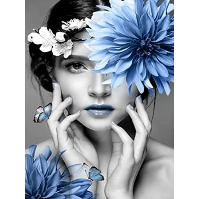 Creative set for creating a Diamond Painting painting with a picture pattern, assorted colored stones, a bowl, a pencil and a small square wax plate Pattern: Woman with flower - elegant face of woman with a wreath of flowers in her hair, framed by two blue dahlias; image size: approx. 35 x 25 cm The complete picture is self-adhesive, so that the colored faceted stones can be applied similarly to the colour legend on the canvas without the need for additional glue. After completion, the artwork can be framed or stretched on a stretcher frame and used to decorate the walls and as a gift. Diamond Painting promotes hand-eye coordination, concentration, patience and creativity of children and adults and contributes to relaxation and stress reduction., Manufacturer: Pracht Creatives Hobby GmbH