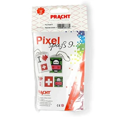 2 pendants to design yourself with small pixel stones, simple plug-in system, no ironing or gluing Motifs: I love Switzerland, Switzerland flag and cow Contents: 2 pendants with chains, 3 original size templates and 12 pixel plates The pixel squares are made from 100% recyclable bioplastic and are approx. 2 x 2 mm Great for children's birthday parties as a small gift or party bag, suitable for children aged 6 and up, promotes concentration and fine motor skills, Manufacturer: Pracht Creatives Hobby GmbH