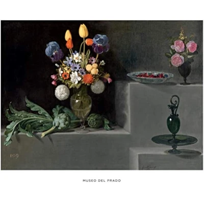 Paper reproduction of the work "Still Life with artichokes, flowers and glass vessels", Juan van der Hamen and Leon, 1627. Madrid, National Prado Museum. Image size: 34.8 x 26 cm Total sheet size: 42 x 33 cm. This reproduction has been made on Invercote G 300 gram paper. The picture reproduces the full work proportional to its original size and includes a white margin for easy framing.