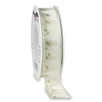 Printed organza with fir and star design with wired edges 20-m-Roll 25 mm width Available in many colours Packaging Tutorials on our homepage pattberg.com