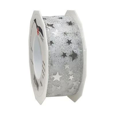 Printed Organza with mettalic Star pattern with wired edges 20-m-Roll 40 mm width Made in Germany. Packaging Tutorials on our homepage pattberg.com