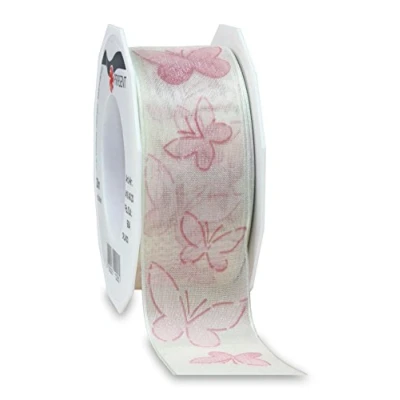 Organza ribbon with wired edges printed with simple Butterfly design 20-m-Roll 40 mm width Available in many colours Made in Germany.