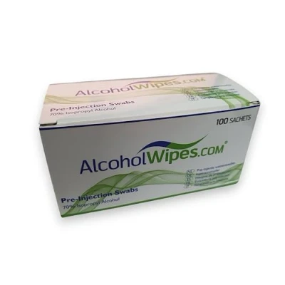 Pre-injection swabs (Skin cleansing alcohol wipes) Contains 70% Isopropyl Alcohol (rubbing alcohol) Approximate size of swabs when unfolded: 3 x 6cm 100 swabs, flat packed box included Long expiry date (Contact us for current batch and expiry details) Please read Product Description below
