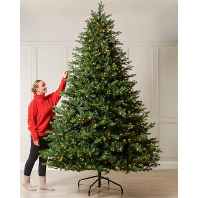 The tree stands 9 ft (270 cm) tall and has a 177.8 cm diameter Made from 6,426 PE and PVC tips for a dense, natural appearance It is pre-lit with 1,000 chasing warm white LEDs and eight lighting functions Includes effects like slow glow, chase, and twinkle modes Features a four-part hinged frame with foldable metal stand