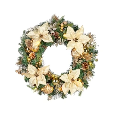 AmazonElegant pre lit cream and gold decorated wreath for a soft luxurious festive look Decorated with cream florals and soft gold accents Warm white lights add a warm luxurious touch Ideal for doors fireplaces and interior walls Crafted for long term festive enjoyment