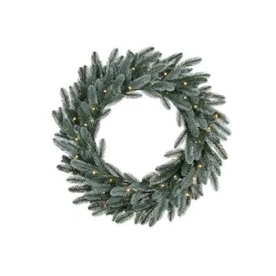 Stylish pre lit frosted blue mixed pine wreath with a unique cool toned festive look Crafted with frosted greenery and cool blue accents Warm lights add a soft cool toned winter brightness Ideal for doors living spaces and feature walls Durable design ensures long term seasonal enjoyment